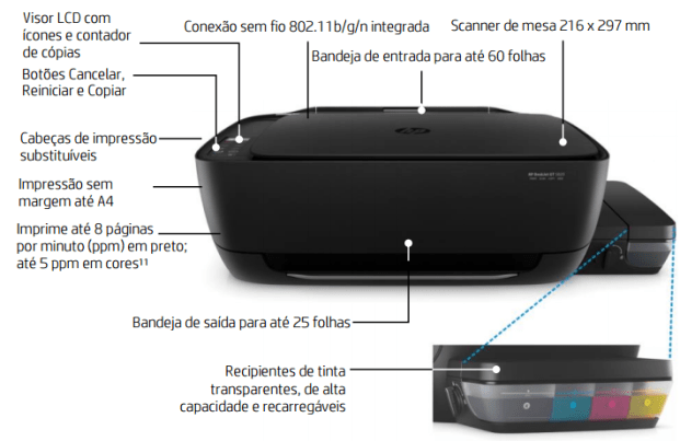 Por ser uma multifuncional o equipamento é praticamente completo, imprime, escaneia e faz cópias. A HP GT 5822 possui um pequeno visor em LCD com todas as informações do equipamento, e botões para conectividade sem fio, escaneamento e cópia direta.