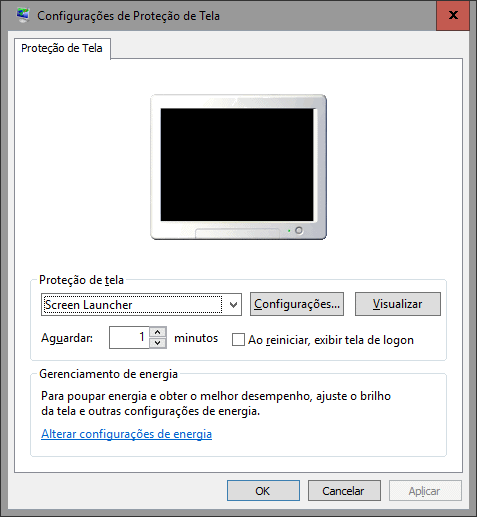 - O processo de instalação é automatizado e no final da instalação, a janela de configuração de proteção de tela do Windows será aberta. Selecione a proteção de tela “Screen Launcher” e clique no botão ao lado, em “Configurações”;