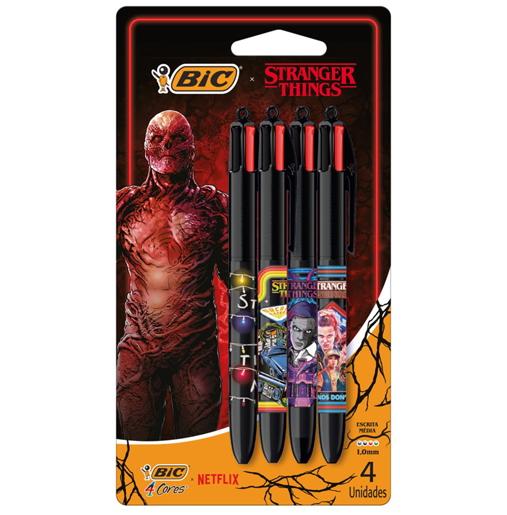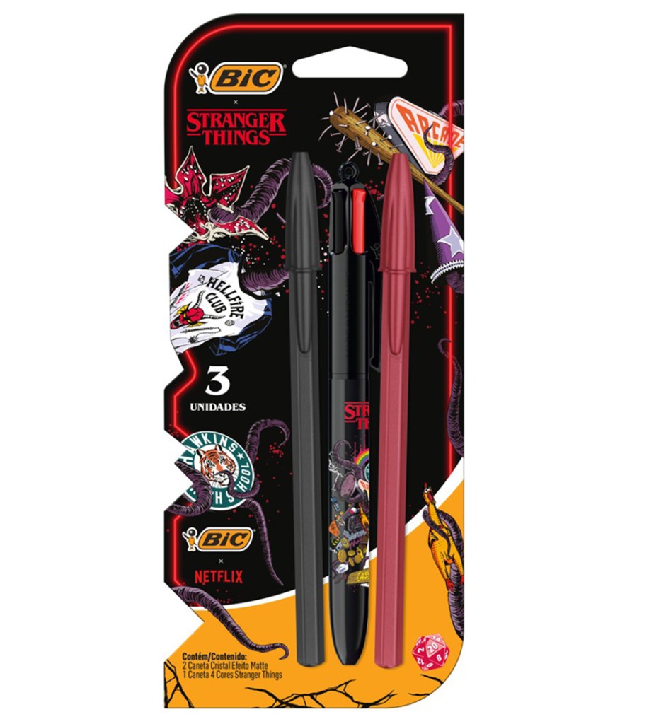 A nova série de canetas mantém o sistema clássico da BIC 4 Cores, com as cores azul, preto, vermelho e verde acionadas por clique, mas traz corpos personalizados com ícones e elementos da série “Stranger Things”. As unidades possuem a clássica ponta média de 1,0 mm.