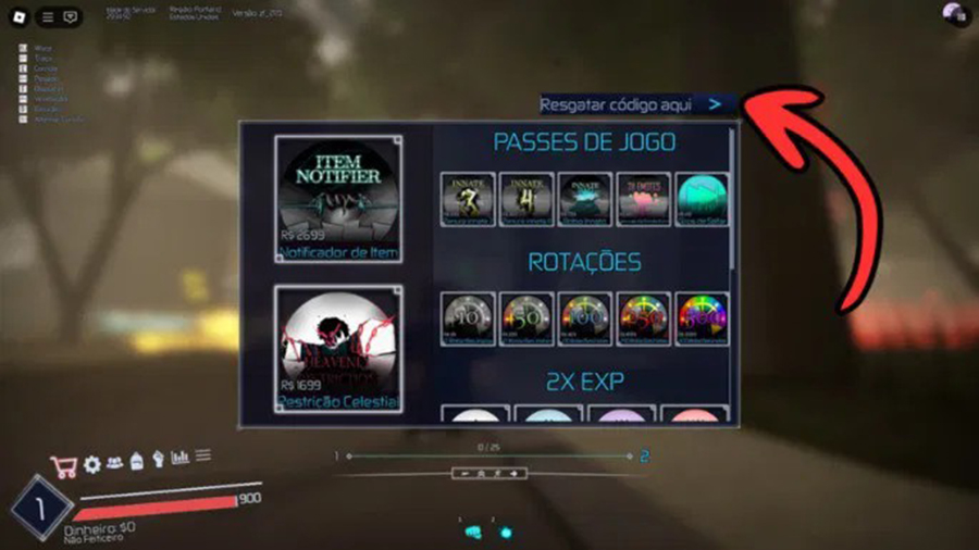 Quando clicar nesse botão, aparecerá uma janela com alguns itens que podem ser comprados. Acima dessa janela, há um espaço que diz “Resgatar código aqui”, conforme mostrado na imagem abaixo.
