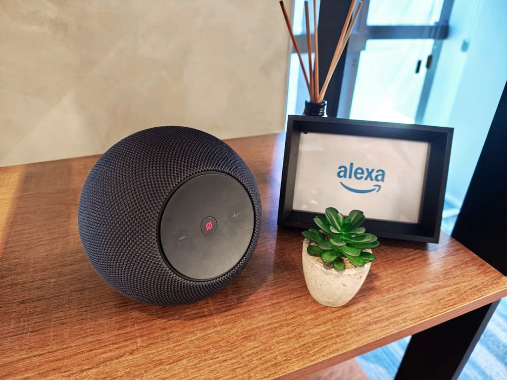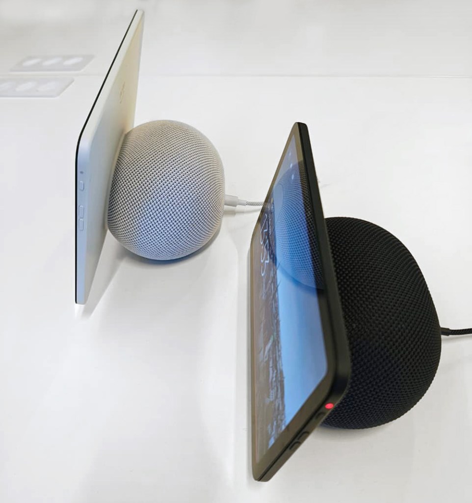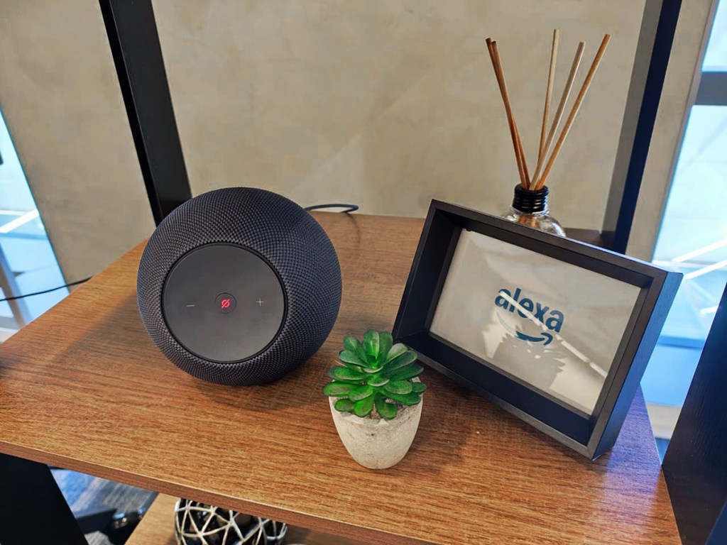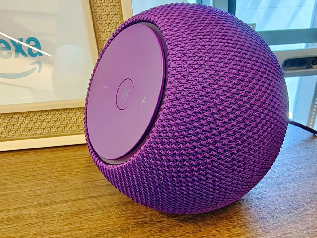 A nova versão do Echo Studio tem design esférico mais compacto (cerca de 40% menor que o modelo anterior) e um tecido acústico (chamado de tridimensional) para manter transparência sonora.