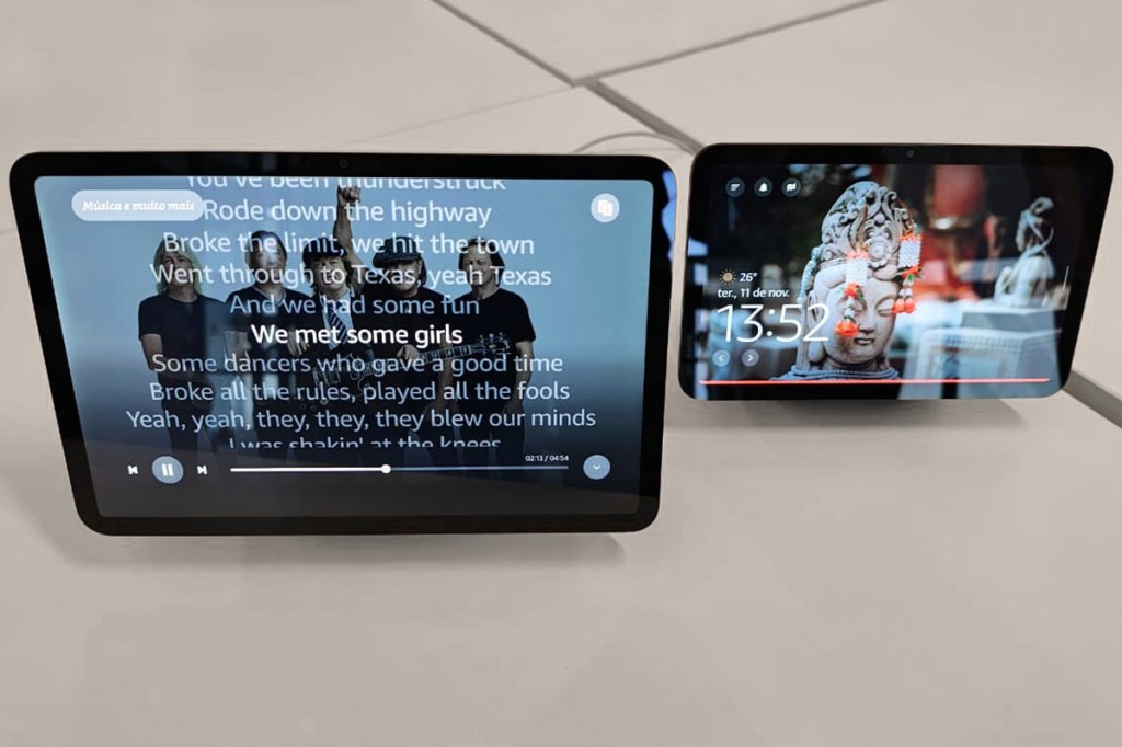O Echo Show 11 traz uma tela maior, de 11 polegadas em Full HD, com design que compartilha a mesma base de vidro “flutuante” dos novos modelos. O áudio também segue a mesma proposta do Show 8: alto-falantes estéreo frontais e woofer para reforçar o som espacial, voltado diretamente ao usuário.